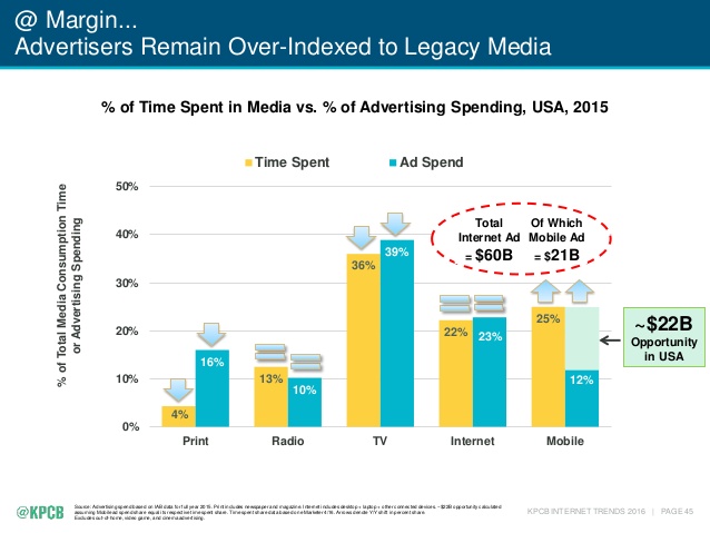 Mobile advertising is underused. Internet advertising exploded from nothing to $60 billion in 20 years. Yet it still has room to grow. Consumers have shifted their attention to the internet, especially through mobile devices. But advertisers remain overly enamored with traditional media and underspend on mobile advertising by about $22 billion. That presents an opportunity for businesses with effective mobile advertising campaigns. While Google still dominates online advertising, Facebook is growing faster, with 59 percent advertising revenue growth between 2014 and 2015, compared to Google’s 18 percent increase.